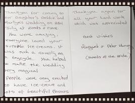 Thankyou for your lovely email, Sarah and i would lie to thank you for the great service you did on our wedding day, Iv had so many of our friends mention how yummy the icecream was and that they had never seen a icecream bike before. Also the pictures we had taken of us serving each other look great.